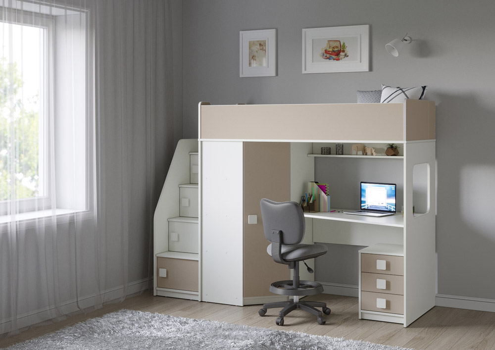 Учебная зона со столом под спальным местом открывает возможности для письменных работ, а также здесь удобно расположить ноутбук. Тумба Л-04 обеспечит хранеие канцелярских принадлежностей и учебников.